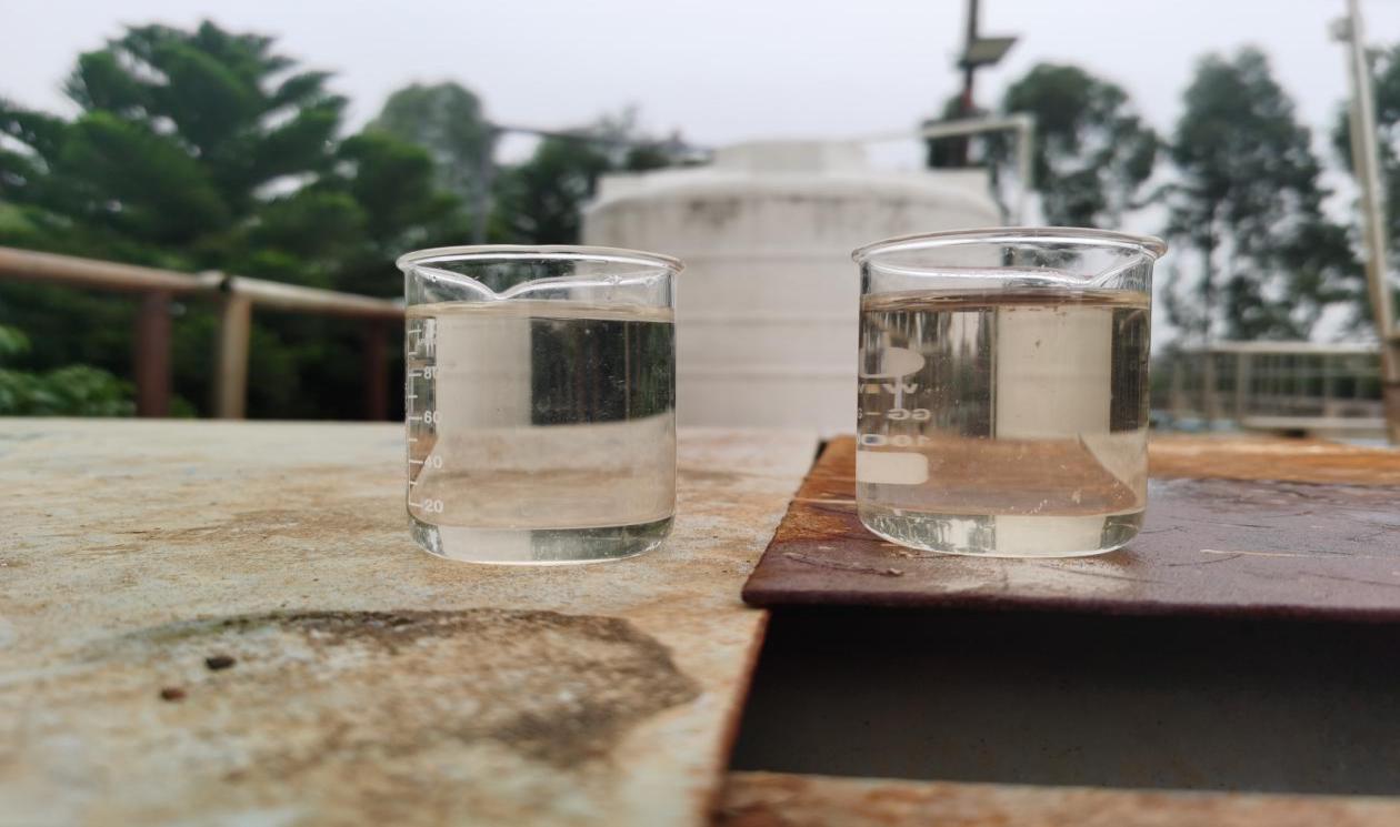 凡清實(shí)驗(yàn)室取回原水,經(jīng)過(guò)反復(fù)實(shí)驗(yàn)得出。取原水100ml,使用復(fù)合堿將PH值調(diào)至7.5,然后加入300ppm的FQ-WD13,然后加入200ppm的凈水劑,攪拌10S,然后加入1.5%的聚丙烯酰胺陰離子(1‰的水溶液)攪拌10S。注:左圖為上機(jī)實(shí)驗(yàn)取上清液,右圖為現(xiàn)應(yīng)急處理后二沉池出水。