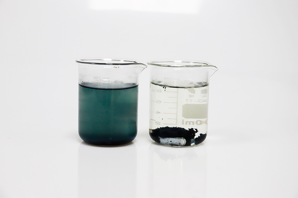 今年二月,安徽省某造紙廠廢水出現色度異常情況,為了不影響污水其他指標,經過多方咨詢找到凡清廠家。取得聯系后寄來500ML原廢水。拿到樣品后隨即展開了實驗。測試完原廢水的PH值,直接將污水脫色劑加入水中,攪拌數分鐘后進行沉淀得到如圖效果